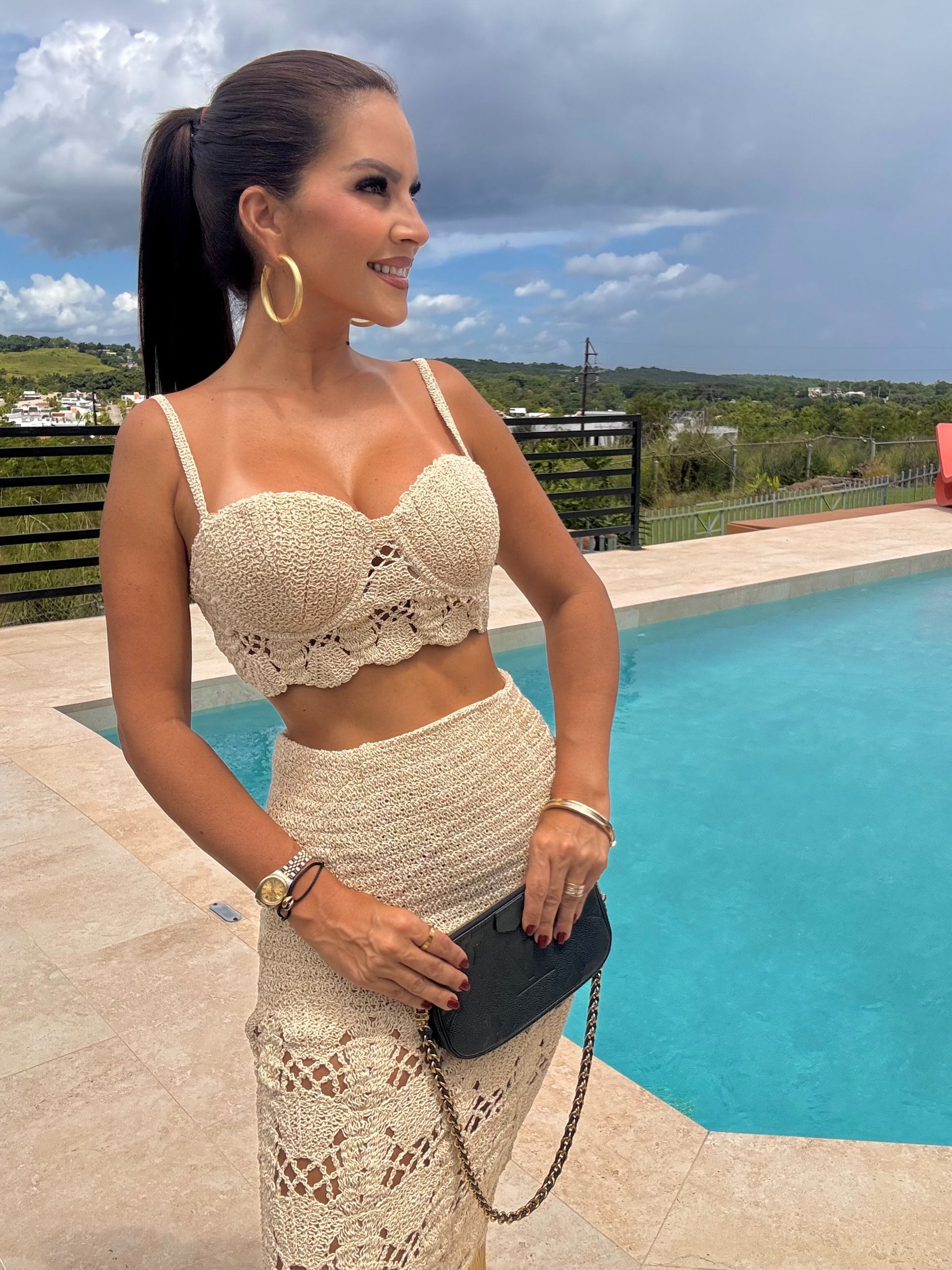 El Concha Set es un conjunto artesanal que combina delicadeza y estilo boho-chic. Incluye un top tipo bralette tejido con copas estructuradas y una falda midi ajustada con transparencias geométricas y flecos largos al final, que añaden movimiento y un aire sofisticado.
