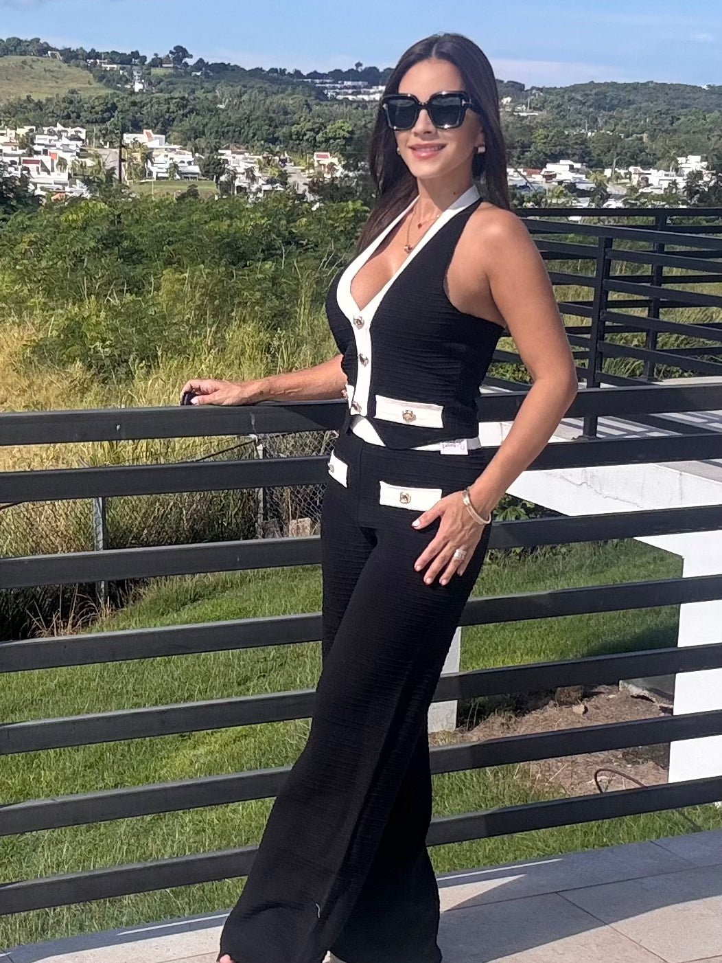 Elegancia moderna con un toque clásico. Este set combina un top tipo corset sin mangas con cuello en V y botones dorados, junto a un pantalón de pierna ancha con detalles en contraste blanco que realzan la figura.