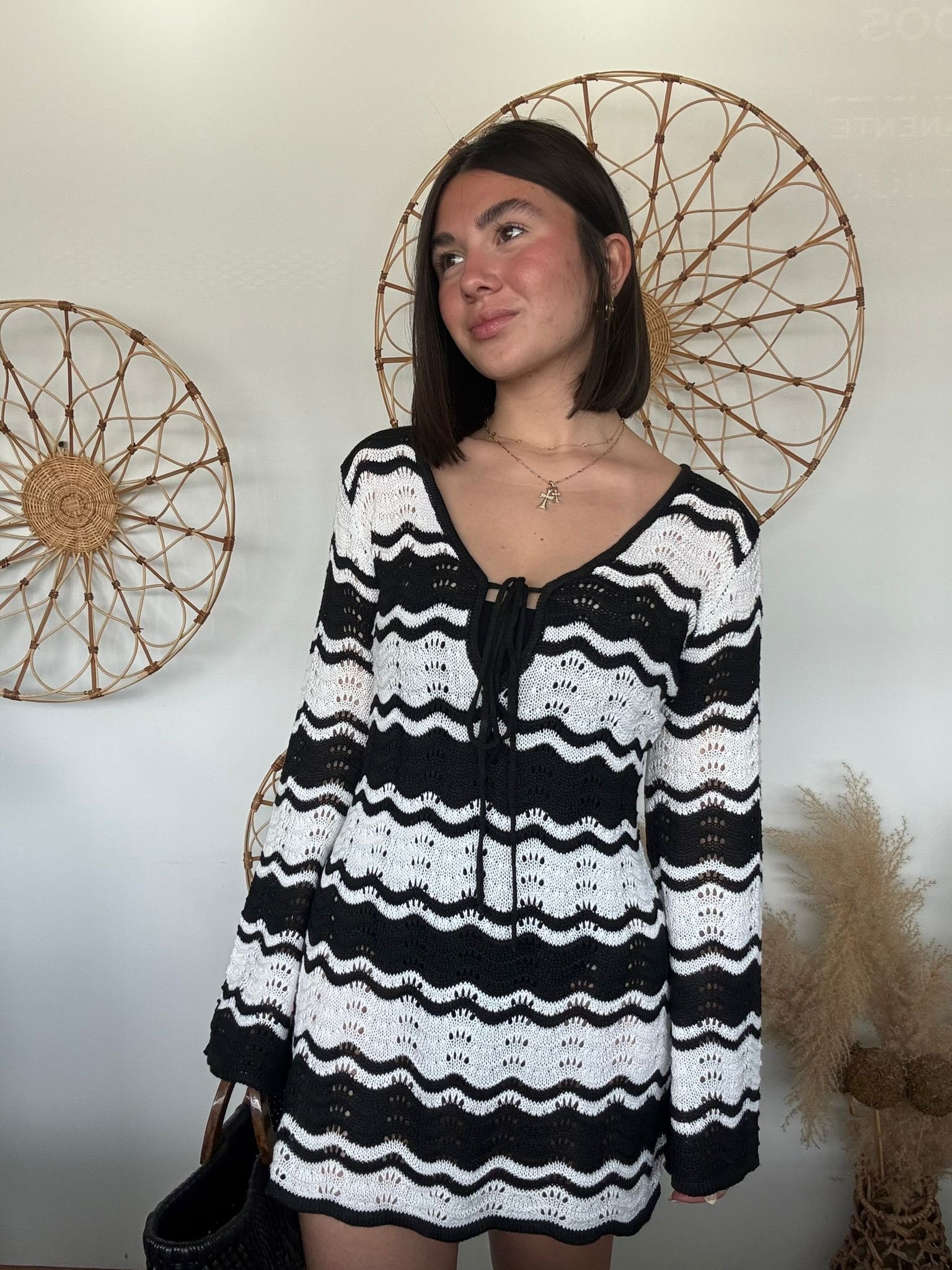 Cover UP tejido en crochet con diseño de ondas en blanco y negro. Su tejido ligero y textura abierta lo hacen ideal para usar sobre traje de baño o como un look casual con estilo. Cuenta con escote ajustable con lazo al frente y mangas largas, brindando un toque femenino y relajado.