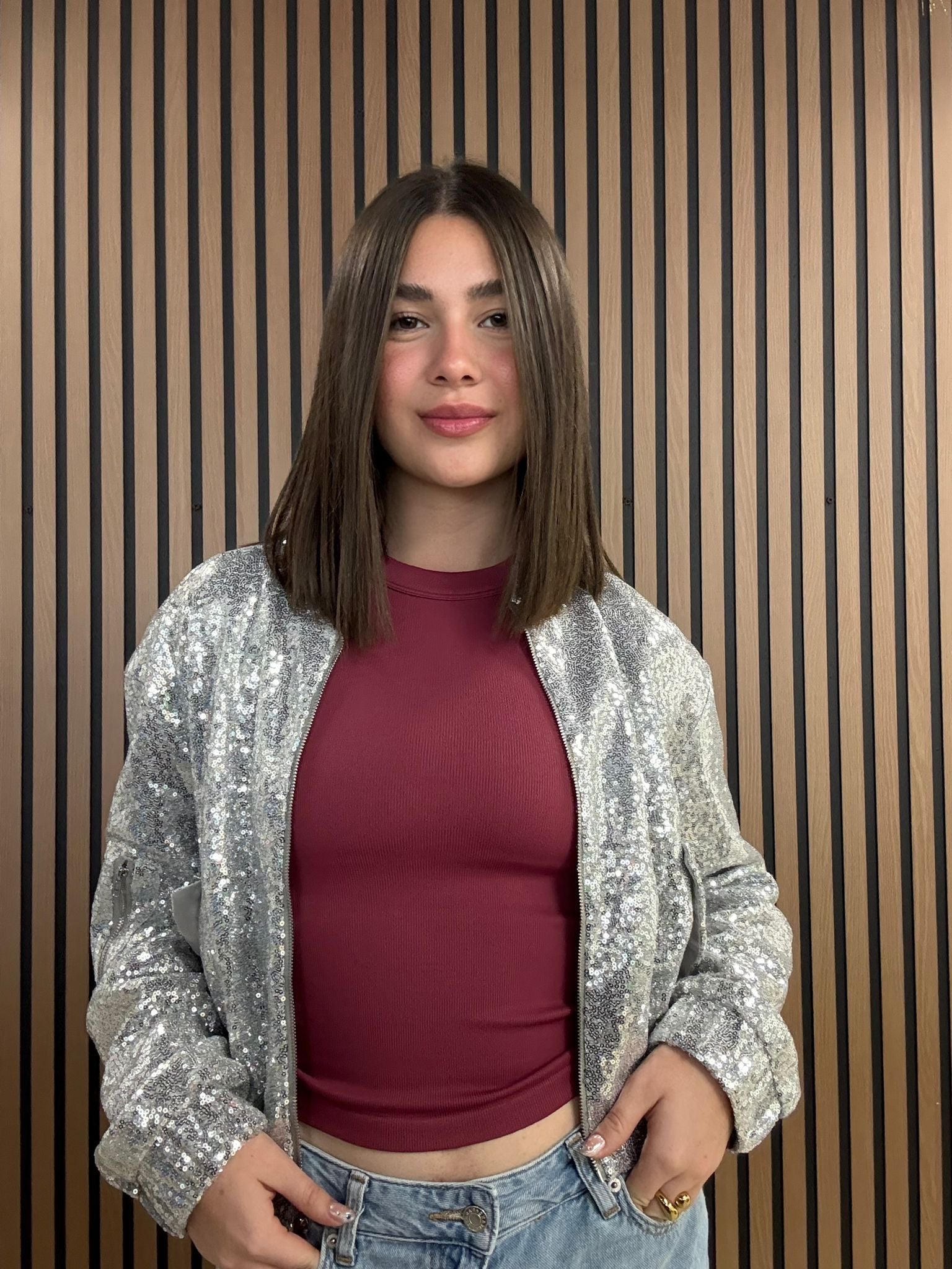 - Jacket estilo brillante en tono plata
