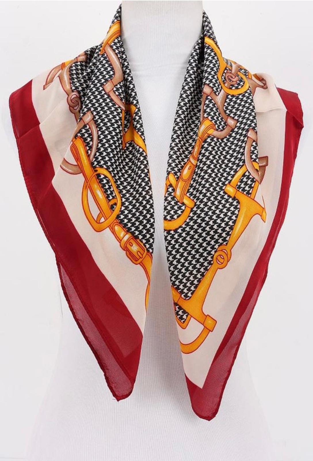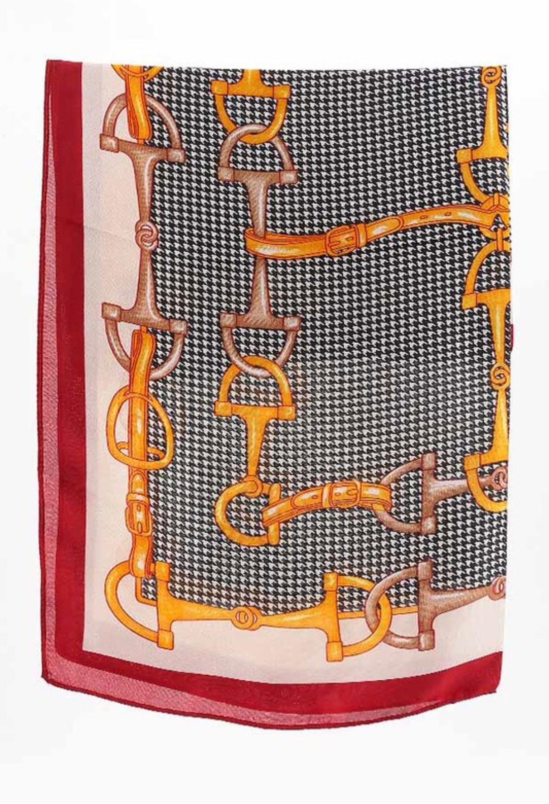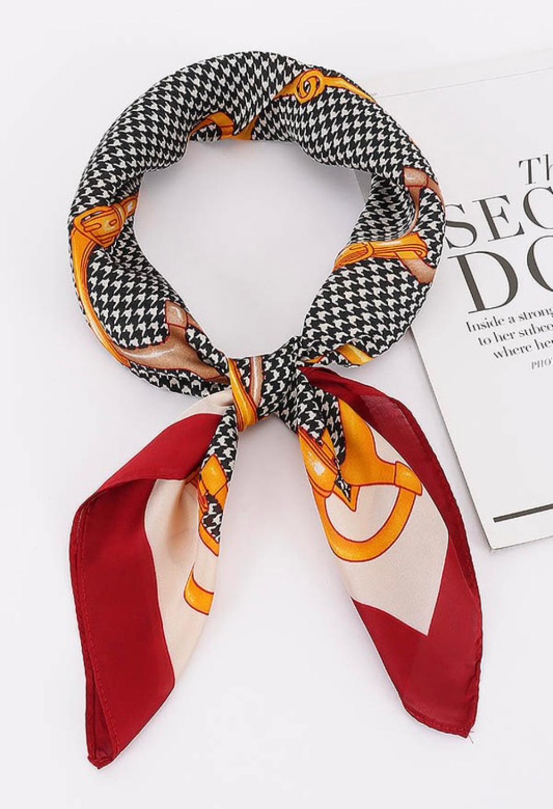 Pañuelo de satén con estampado clásico y toque elegante. Combina patrones de pata de gallo en blanco y negro con detalles en tonos vino, dorado y beige, creando una pieza versátil y sofisticada. Su textura suave y brillante aporta un acabado refinado ideal para elevar cualquier look.