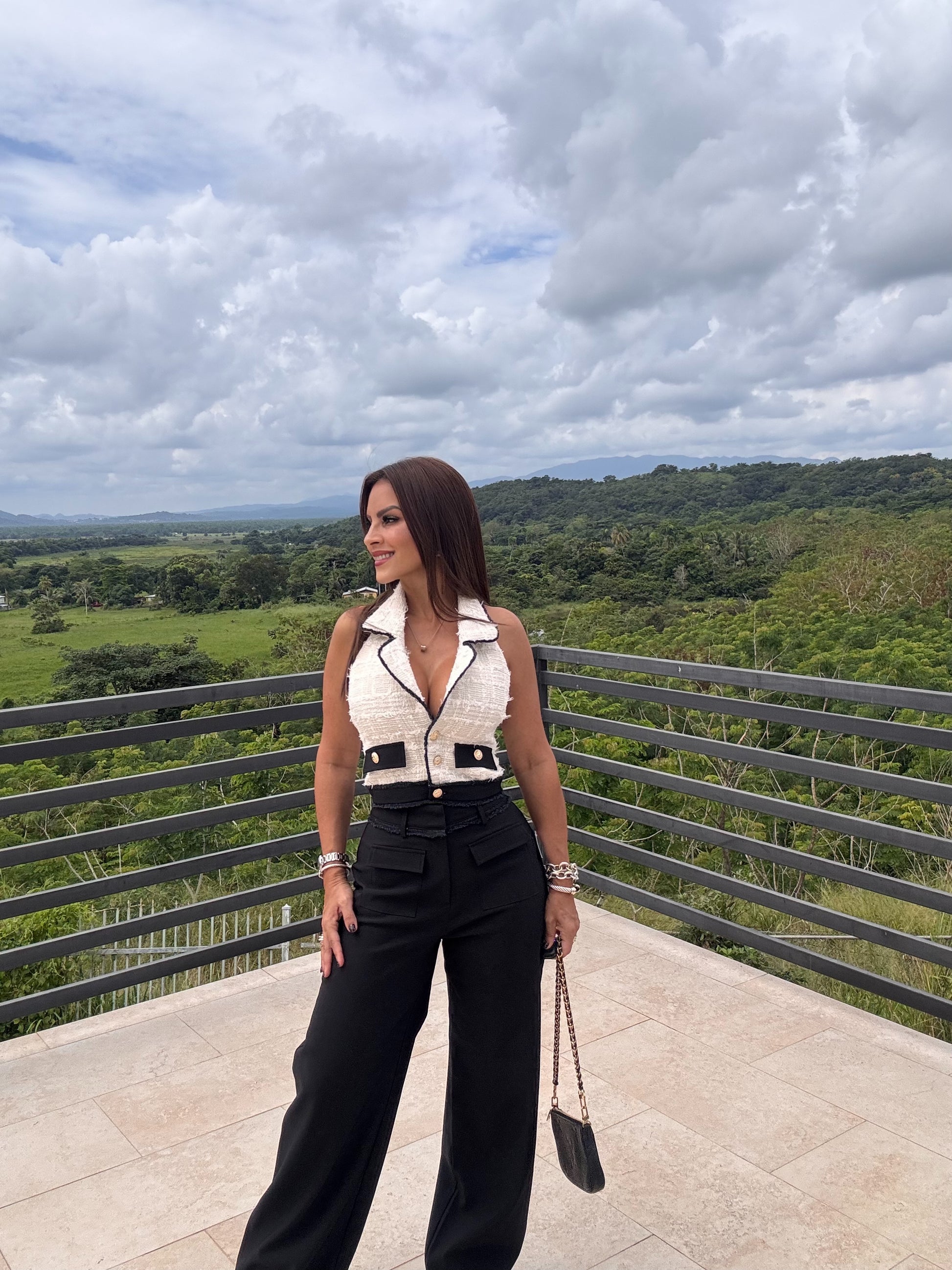 Elegante, moderno y con un toque audaz. Este conjunto combina la sofisticación del estilo sastre con un diseño femenino y contemporáneo. El top tipo blazer sin mangas destaca por su textura suave tipo bouclé y botones dorados, mientras que el pantalón de pierna ancha aporta estructura y fluidez, alargando visualmente la figura.