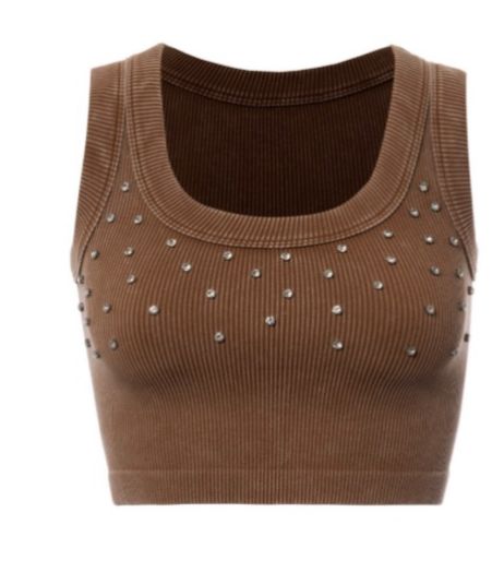 Dale un giro atrevido a tus básicos con este top corto acanalado color marrón con apliques metálicos. Su diseño ajustado y el detalle de tachuelas al frente lo convierten en una pieza versátil y con estilo edgy, ideal para destacar en cualquier ocasión.