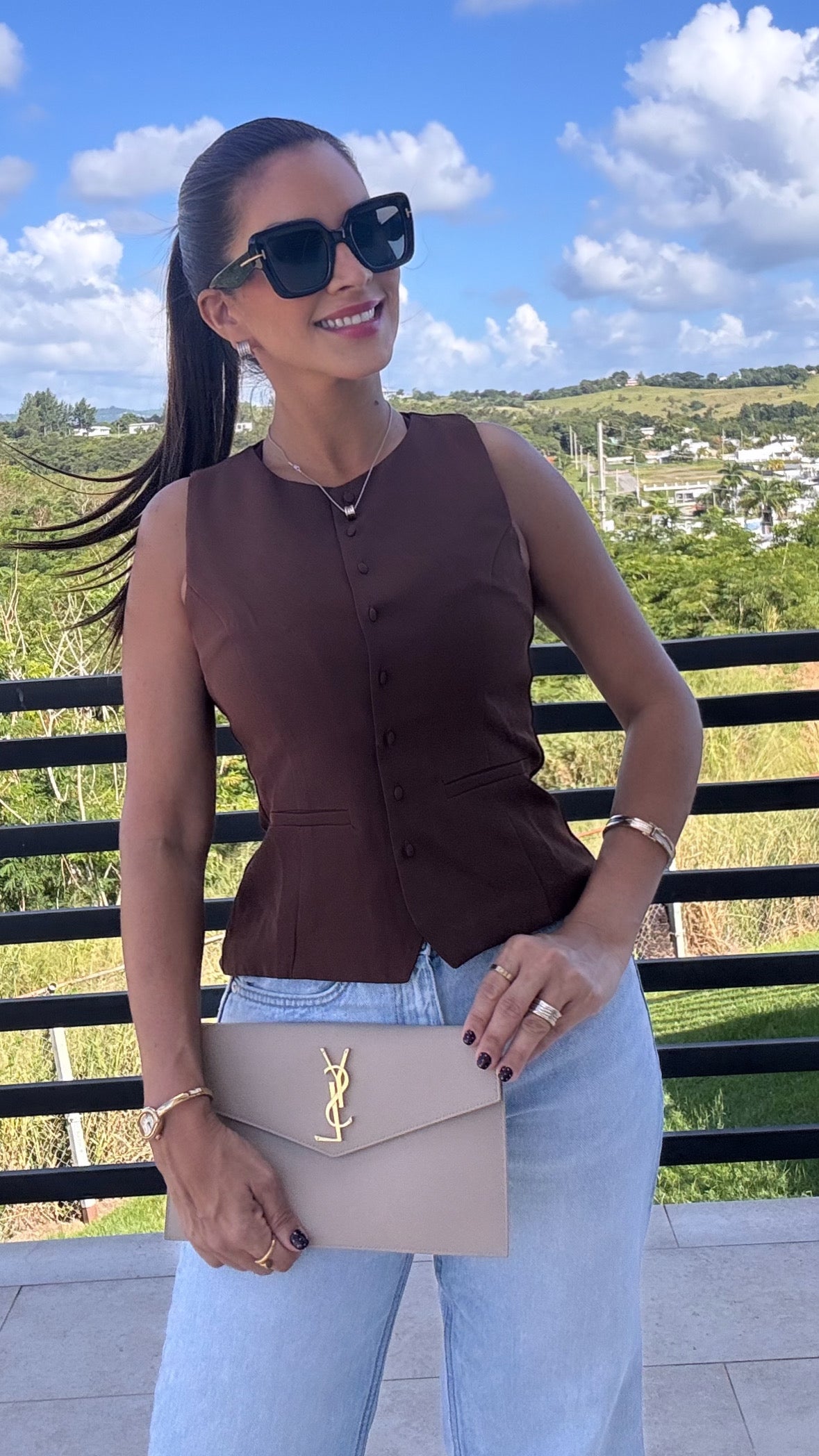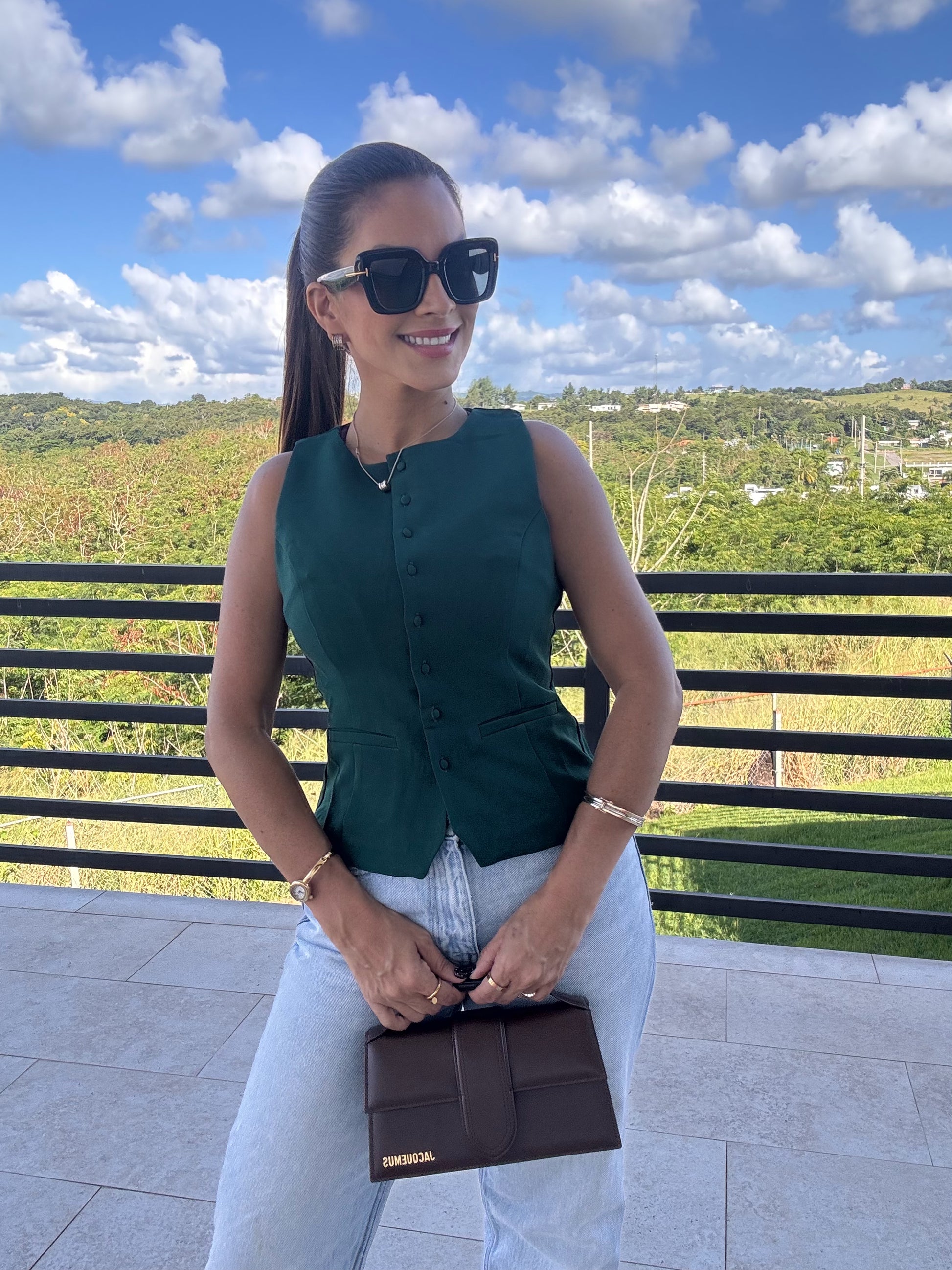 Sofisticado, moderno y lleno de carácter. Este chaleco sin mangas en tono verde y moca esmeralda redefine la elegancia con su corte estructurado y acabado impecable. Su diseño con botones forrados al frente aporta un toque clásico, mientras que la silueta entallada realza la figura de forma sutil y femenina.